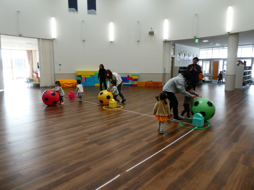 ホール遊びをしたり、親子体操教室でボールリレーをしたりして楽しみました(*^-^*)